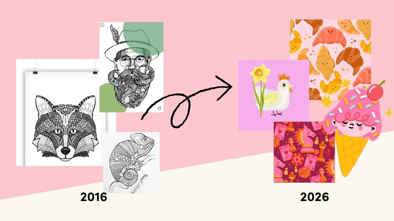 Mein Stil 2016 war zum Beispiel komplett anders als das, was ich heute mache. 2026 habe ich detaillierte Muster gezeichnet und habe wirklich NUR das gemacht. Erst durch das Medium Animation bin ich komplett auf digital geswitcht und zu meinem heutigen Stil gekommen.