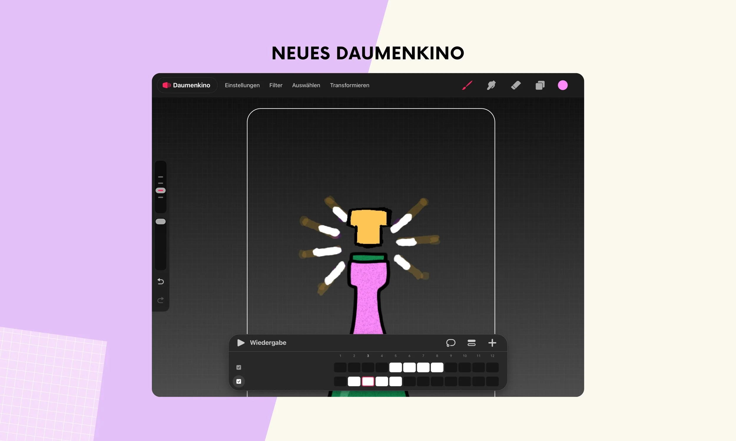 → Das neue Daumenkino ist ein spezieller Modus für Frame-by-Frame-Animationen. Du kannst darin mehrere Spuren gleichzeitig nutzen, einzelne Frames verschieben und die Dauer jedes Bildes individuell anpassen.