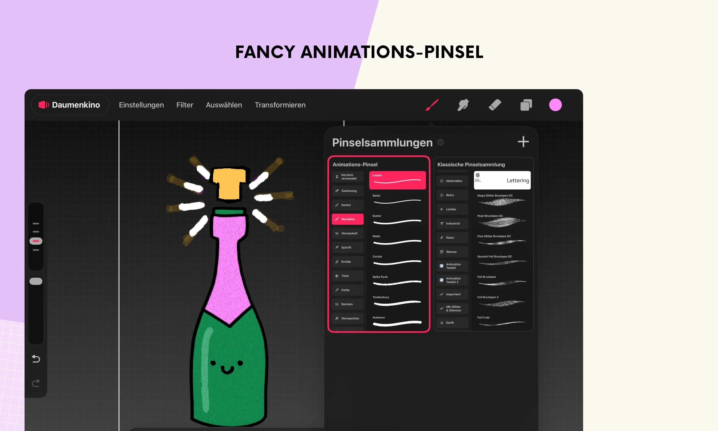 Die Pinselbibliothek wurde angepasst und es gibt jetzt Pinselsammlungen. Hier kannst du wählen zwischen der klassischen Pinselsammlung und richtig coolen Animationspinseln. Außerdem kannst du eine eigene Sammlung mit hinzufügen.
