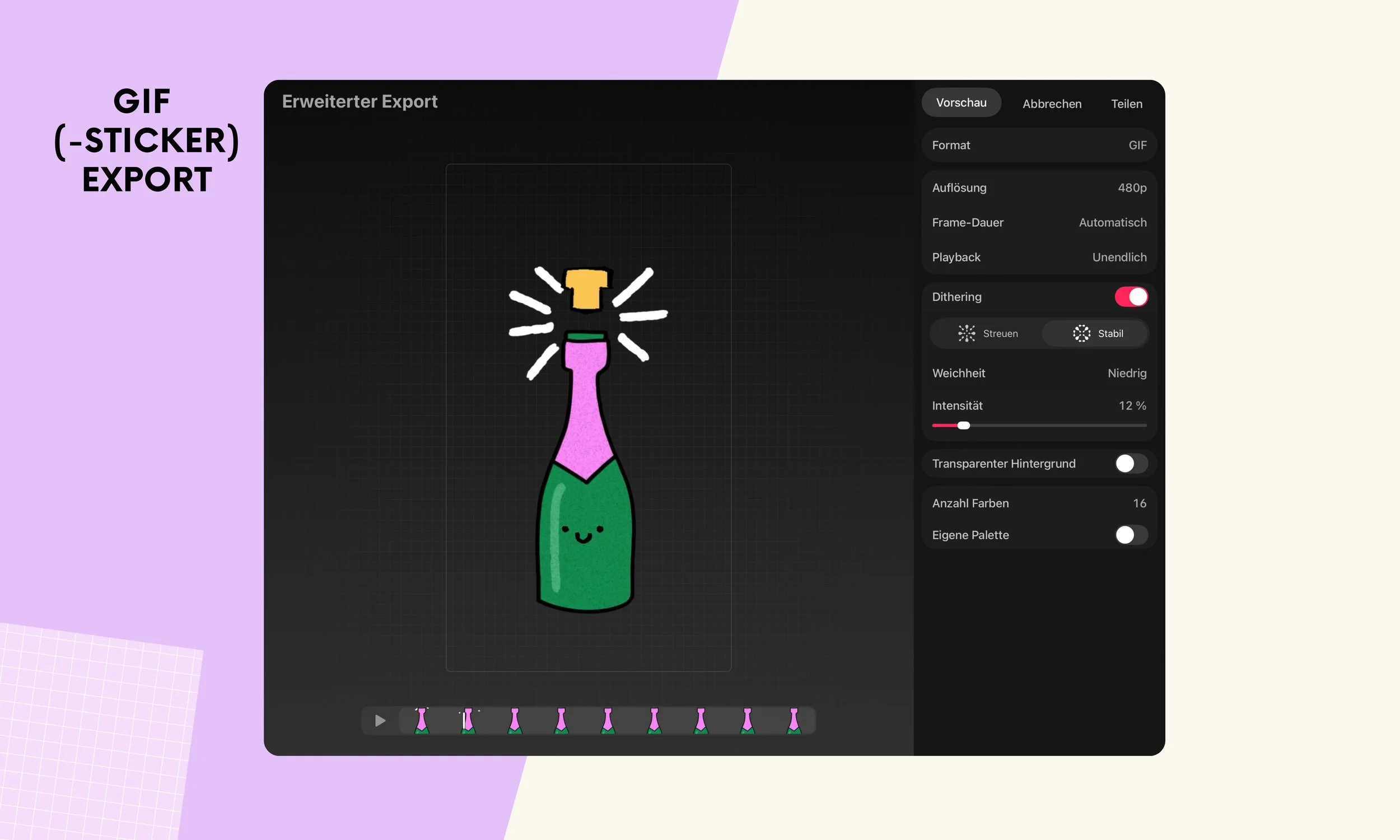 Exportiere das Ganze als GIF mit transparentem Hintergrund – fertig ist dein Party GIF.